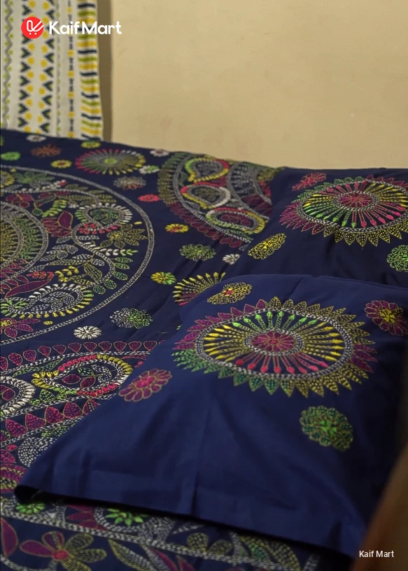 Bring home the elegance of Bangladeshi tradition with this Handmade Nakshi Bed Sheet. Beautifully hand-stitched on a rich blue fabric, decorated with vibrant floral designs.