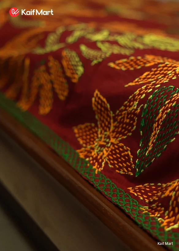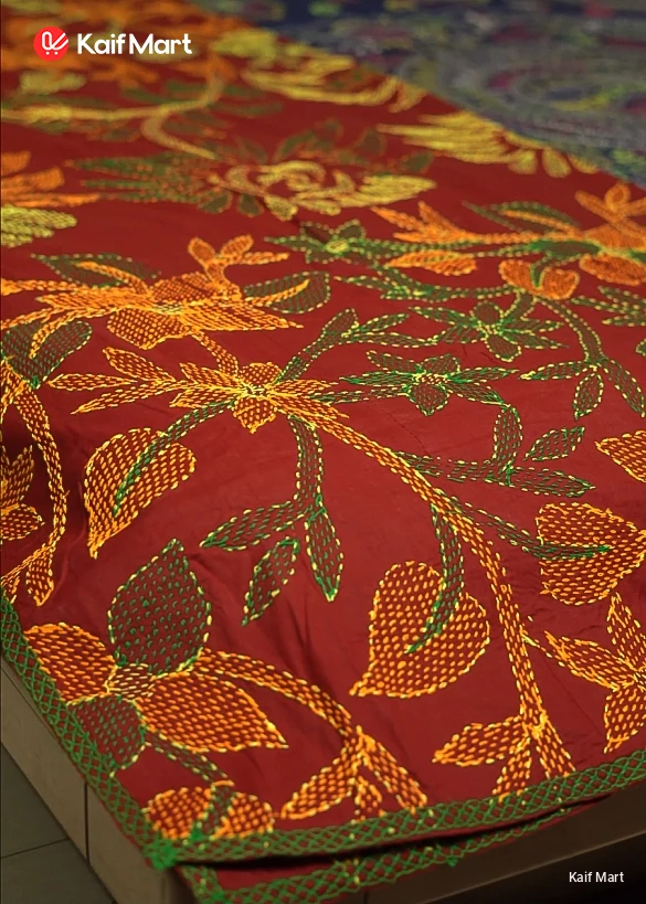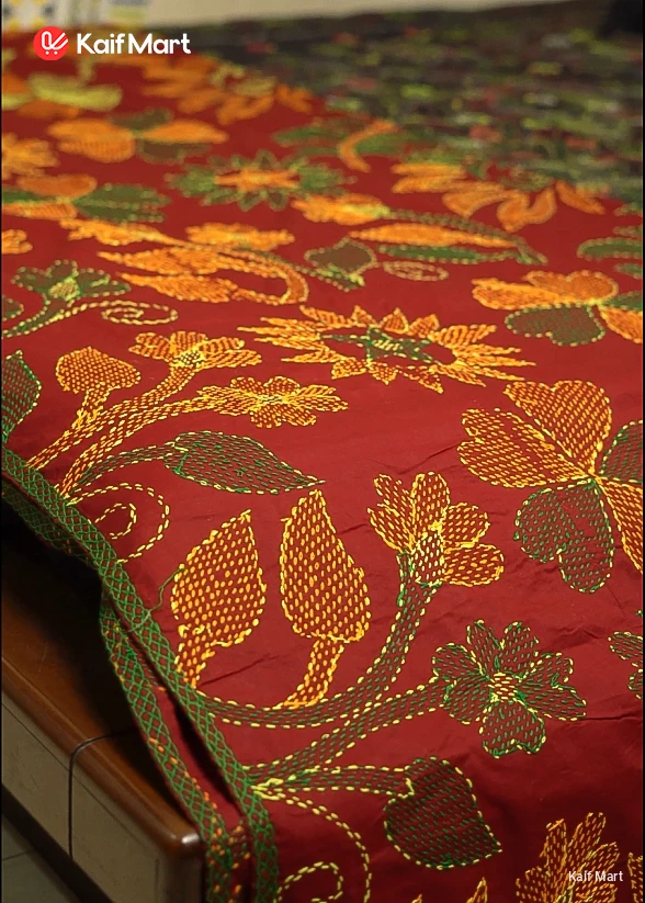 Bring home the elegance of Bangladeshi tradition with this Handmade Nakshi Katha. Beautifully hand-stitched on a rich red fabric, decorated with vibrant floral designs in yellow and green threads.